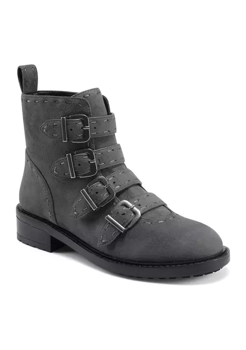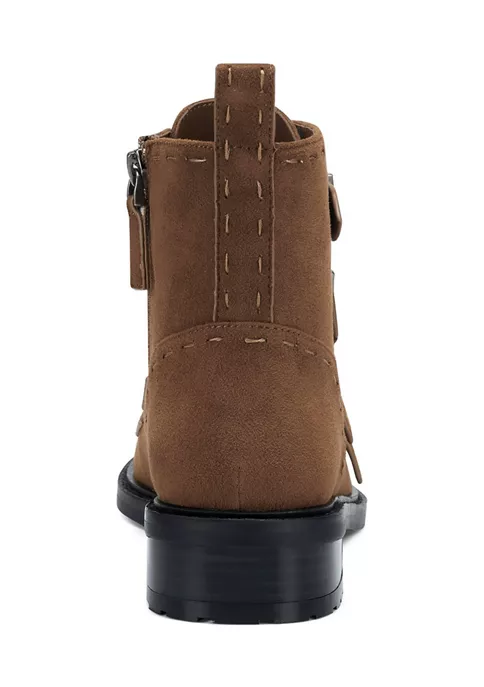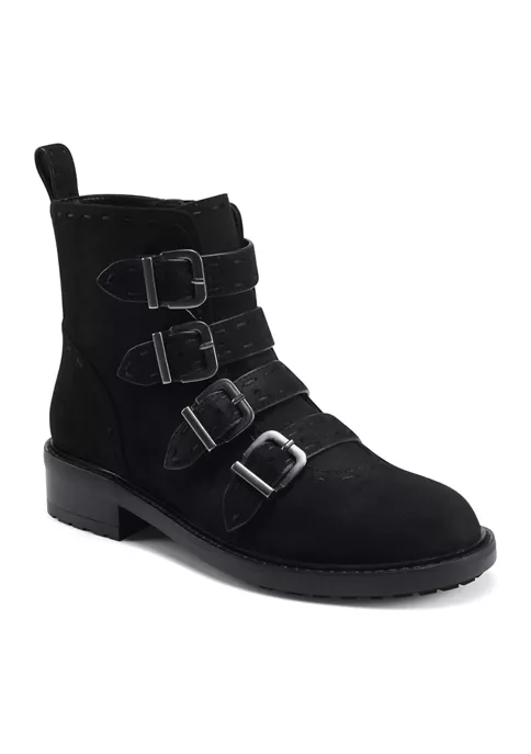 Bold buckles make an edgy style statement on the rugged Arezzo boot, designed in soft faux suede. Topstitching infuses a subtle sense of contrast; finished with a zipper closure. 1 1/2″ Heel. All synthetic materials.