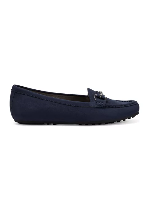 Crafted with faux leather in various neutrals, this season’s Day Drive loafer is all about ease. Its timeless design has been updated with rubber tread on the sole and a metallic accent across the top. Wear it with a midline skirt or tailored trousers for an outfit that’s relaxed yet sophisticated. 1/4″ Heel Height. Synthetic Upper and Materials. WIdes