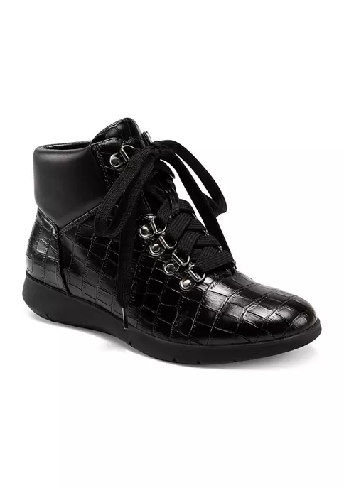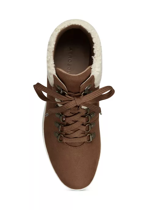 Cozy meets chic: Designed in soft faux suede, the Frankie lace-up boot is accented by plush shearling trim. A rugged yet style-conscious choice for your off-duty look. 1 1/4″ Heel. All synthetic materials.