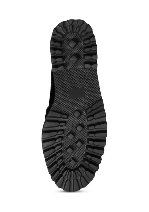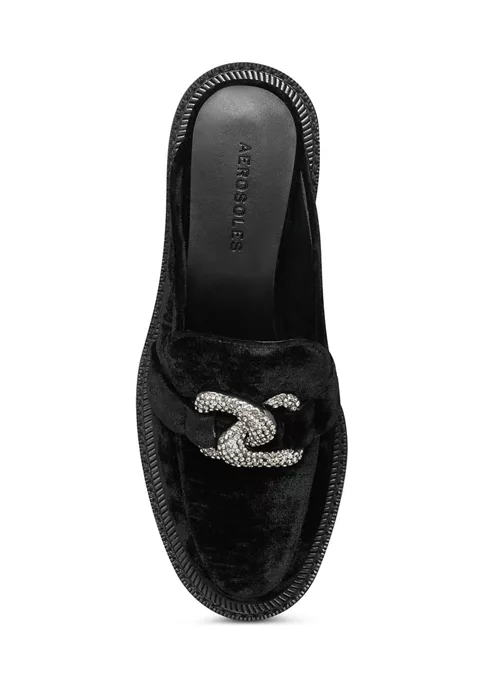Loafer and mule silhouettes merge perfectly in the Lowery, elevated by a leather stacked heel. Shimmering gunmetal link hardware illuminates plush velvet for a luxurious finish. 2″ Heel. Velvet Upper, balance Synthetic Materials.