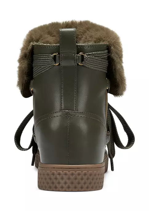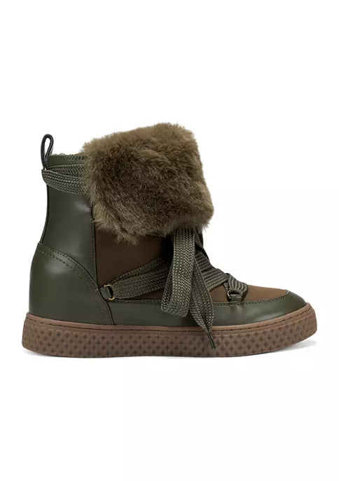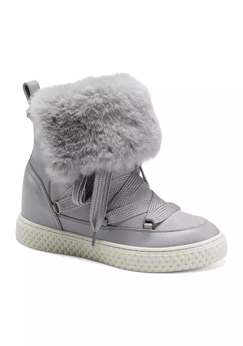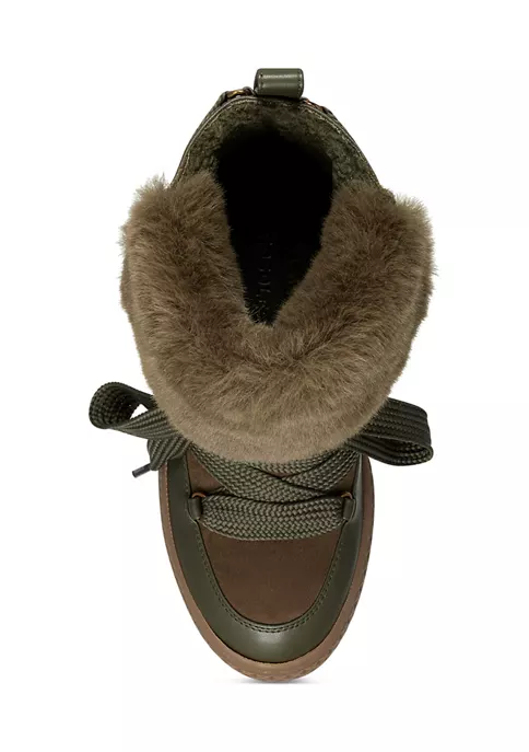 Warming trend: Cozy up to the Zoya lace-up boots, featuring a plush faux-shearling cuff. Textured cupsoles complete the look with a sporty twist.